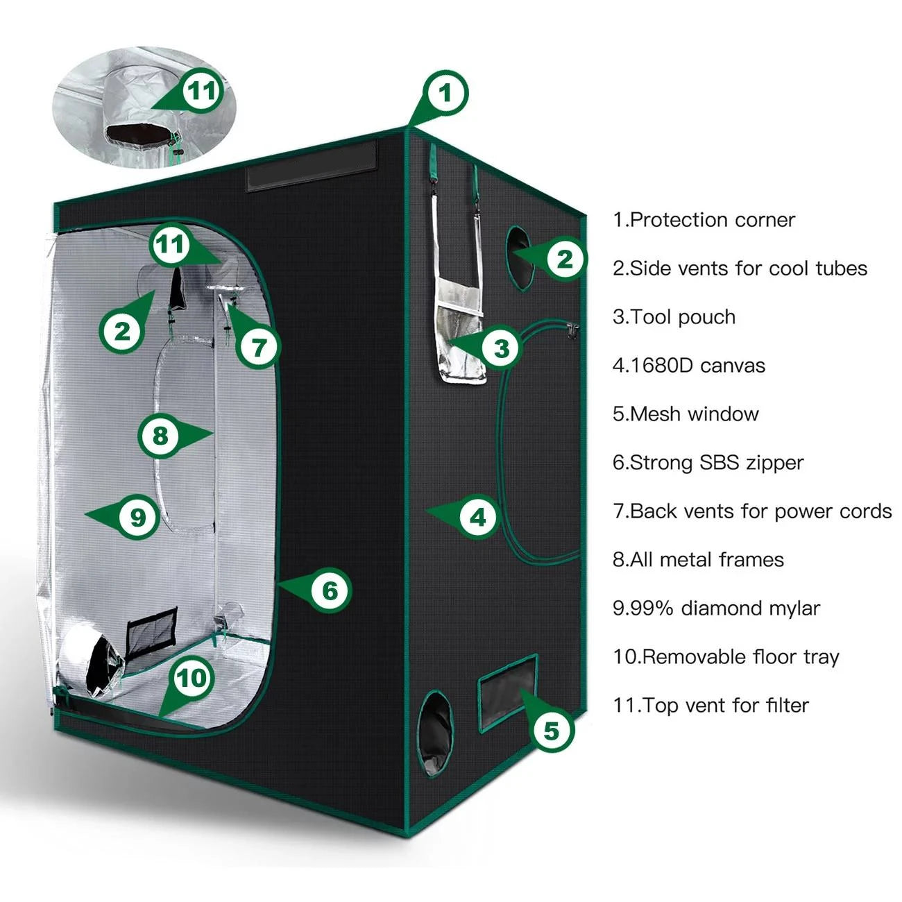 • Removable Waterproof Floor Tray: Mess-free maintenance. The kit includes a separate Mylar-lined floor tray that catches spills and runoff, protecting your floorboards and making it easy to deep-clean between harvests.
